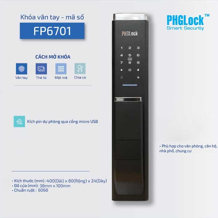 Thông số kỹ thuật khóa cửa vân tay cho căn hộ sang trọng PHGLOCK FP6701